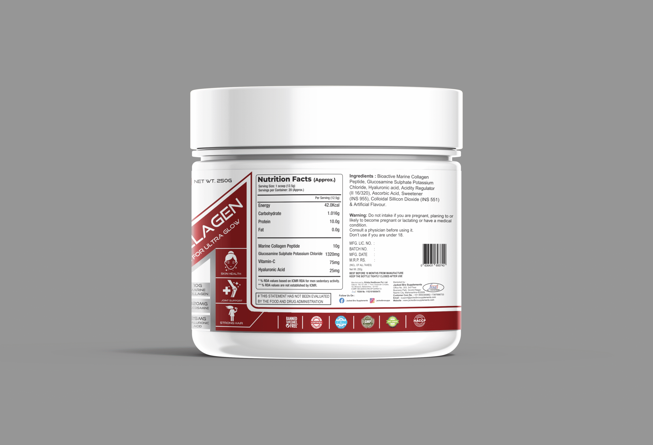 COLLAGEN IS ESSENTIAL FOR MAINTAINING SKIN ELASTICITY AND HYDRATION AS WE AGE, THE PRODUCTION OF COLLAGEN DECREASES LEADING TO WRINKLES AND DRYNESS, SUPPLEMENTING WITH COLLAGEN MAY HELP IMPROVE SKIN ELASTICITY, MOISTURE AND OVERALL APPEARANCE & GLOW. MARINE COLLAGEN ALSO PLAYS A SIGNIFICANT ROLE IN MAINTAINING BONE AND JOINT HEALTH COLLAGEN IS A MAJOR ORGANIC COMPONENT OF BONE PROVIDING FLEXIBILITY AND STRENGTH. IN JOINTS, COLLAGEN IS A PRIMARY CONSTITUENT OF CARTILAGE, THE RESILIENT TISSUE THAT CUSHIONG THE ENDS OF BONES AND ALLOWS FOR SMOOTH MOVEMENT.